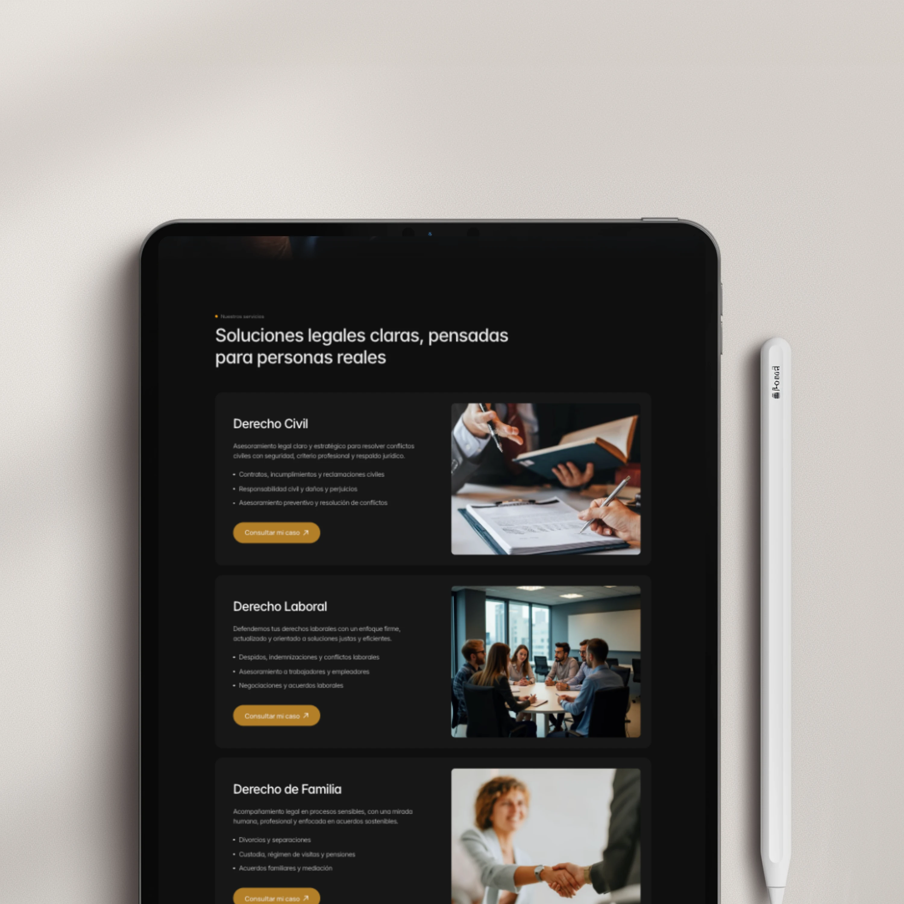 Un sitio web pensado para estudios jurídicos que buscan transmitir confianza, profesionalismo y claridad desde el primer contacto. La estructura está diseñada para presentar los servicios de forma ordenada, explicar el proceso de atención con transparencia y facilitar el contacto, acompañando a cada persona en momentos donde contar con información clara es clave.